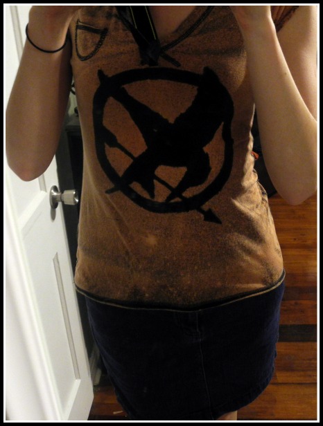 Thanks to the wonder of Pinterest, I found a great Mockingjay template and a neat idea for putting a symbol onto a shirt. Basically, you cut out a symbol/letters on paper, place it on a shirt, and spray bleach around the image. This way, the fabric around the symbol becomes lighter. Peel away the symbol, and you're left with darker fabric underneath.